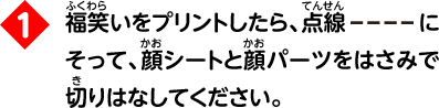 1 福笑いをプリントしたら、点線にそって、顔シートと顔パーツをはさみで切りはなしてください。