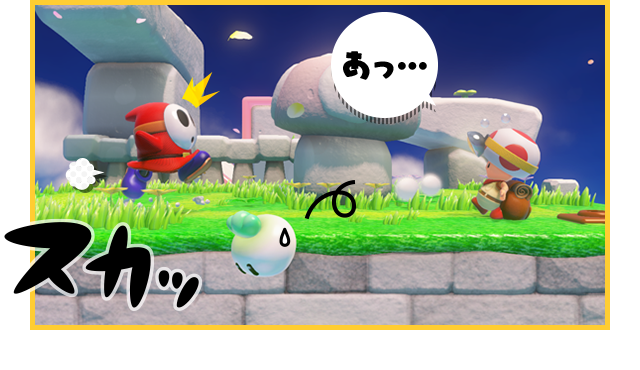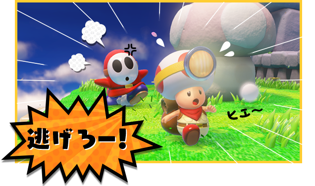 キノピオ隊長のリュックは、実は超重たい!だからキノピオ隊長はジャンプができないよ。そのかわり、カブを抜いて投げたり、トロッコにのったり、カベをほったり、さまざまなアクションを使って、進め!キノピオ隊長!