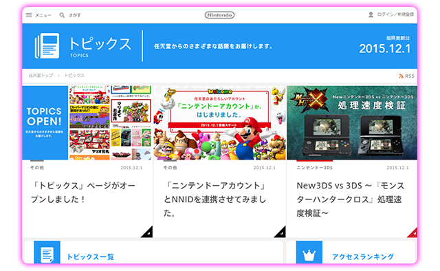 これまでNintendo Newsでお届けしていた、ゲームに関する最新ニュースなどは、今後「トピックス」からお届けしていくよ!