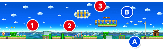 はい、(A)のほうが簡単なルートで、本来のルートのつもりでつくりました。(B)のほうは雲を渡って行かないといけないので難しいんですけど、ゴールポールのてっぺんに行きやすくなっています。