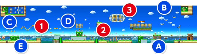 ポポ、ポッポー。(あとは(E)のところだな。ちょっと変わったコインのおき方をした。これはヨッシーのふんばりジャンプの動きに合わせておいているんだ。ヨッシーを使うのが初めての人がいるかもしれないし、いきなり穴の上でジャンプさせるんじゃなくて、足場があるところで安心してジャンプの練習をしてもらうための工夫だよ。)