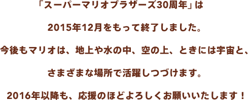 「スーパーマリオブラザーズ30周年」は2015年12月をもって終了しました。今後もマリオは、地上や水の中、空の上、ときには宇宙と、さまざまな場所で活躍しつづけます。2016年以降も、応援のほどよろしくお願いいたします!