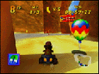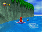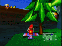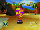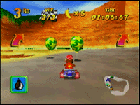 前方にミサイルを発射します。ライバルに当ると、持っているバナナを2つ落としてしまいます。攻撃してバナナを横取りしちゃいましょう。でも、自分が攻撃を受けてもバナナを落としてしまいます。バナナは取るたびに、ビークルの最高速が上がる(最高で10個)貴重なものだから、速く走るには絶対欠かせませんね。