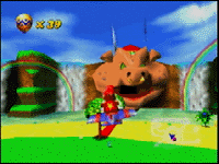 4つのゾーンを2度目のボス戦まで、無事クリア出来たら、中央エリアに出てみましょう。最初は岩の作り物だったウィズピッグの大きな顔が不気味な笑い声をあげてますね。勇気を出して、その口の中へ飛び込んでみましょう。 |