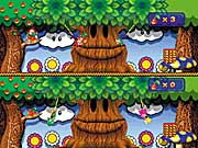 それぞれの頭上で回転しているブロックを、ジャンプでたたいて止めます。チームの2人が同じ絵を止めることができれば、絵に応じてポイントが入ります。