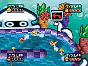 モーターボートに乗ってレースをします。制限時間の3分以内に5周したプレイヤーの勝ちです。