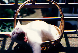 | かごで おおあくびの 『ぼぢ』。 なんだか すごいかお……。 |