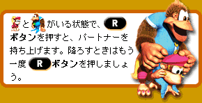 ディクシーがディンキーを持ち上げて、十字ボタンの上を押しながら投げると、着地したときの衝撃でひびの入った床をこわすことができます。