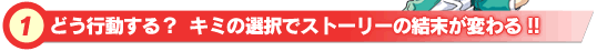 | 物語の中でどう行動するか?判断をくだすのはキミだ!選択を重ねる事で、ストーリーは幾重にも分岐してゆくぞ。デキストアドベンチャーだから味わえる様々な展開を心ゆくまで楽しもう! |