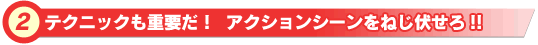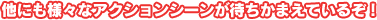 | アクションシーンとは、物語の途中で突然始まるプチゲームだ!成功するか、失敗するか・・・物語の展開に大きく影響するぞ!キャラクター達になりきってアクションシーンをねじ伏せろ! |