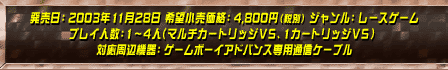 発売日:2003年11月28日(金) 希望小売価格:4,800 円(税別) ジャンル:レースゲーム プレイ人数:1人〜4人(マルチカートリッジVS、1カートリッジVS) 対応周辺機器:ゲームボーイアドバンス専用通信ケーブル