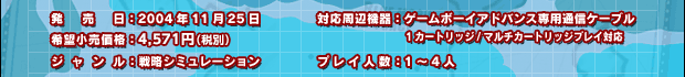 発売日:2004年11月25日/希望小売価格:4,571円(税別)/ジャンル:戦略シミュレーション/対応周辺機器:ゲームボーイアドバンス専用通信ケーブル[1カートリッジ/マルチカートリッジプレイ対応]/プレイ人数:1〜4人