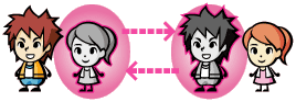 パスワードを使って2人で行います。”プロポーズのあいことば”を入力して友達に伝え、友達から”お礼のあいことば”を教えてもらい、入力をすると通信けっこんをします。通信けっこんがおわるまで通常のゲーム画面に戻ることはできません。 |