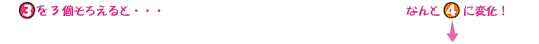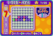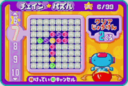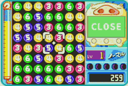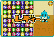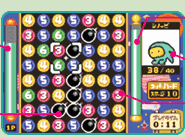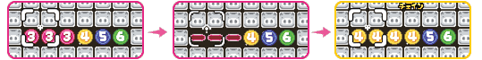 は3個以上、 は4個以上・・・というように、同じすうじパネルをタテかヨコに並べると、 は に、 は に・・・というふうに次のすうじに変化します。 が6個以上そろうと、そのパネルは消えます。このパネルが変化したり、消えたりするのが続いていくことをチェインといいます。どの数字からそろえてもOKです。 |