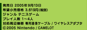 発売日 2005年9月13日 希望小売価格 3,619円(税別) ジャンル テニスゲーム プレイ人数 1〜4人 対応周辺機器 専用通信ケーブル / ワイヤレスアダプタ (C)2005 Nintendo / CAMELOT