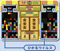 ひかるウイルスは通常のウイルスと同じ方法で撃退できます。戦略をもって順序良くウイルスを撃退することが勝利のカギです。 |