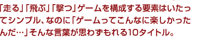 「走る」「飛ぶ」「撃つ」ゲームを構成する要素はいたってシンプル、なのに「ゲームってこんなに楽しかったんだ…」そんな言葉が思わずもれる10タイトル。