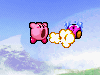 | カービィは空気をいっぱいに吸い込んで、ホバリングで空を飛ぶことができます。また、飛行状態で空気をはきだすと、空気弾がうてます。 |
