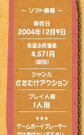 ストーリー 発売日:12月9日/希望小売価格:4,571円(税別)/ジャンル:アクション/プレイ人数:1人用/★★★ゲームボーイプレーヤーでは遊ばないで下さい。