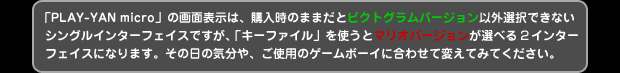 | 「キーファイル」をそのまま使用すると、「PLAY-YAN micro」の標準インターフェイスが「マリオバージョン」になります。「ピクトグラムバージョン」を表示したい時は電源を入れた後、「警告−健康と安全のために」が出るまでLまたはRボタンを押し続けてください。 |
