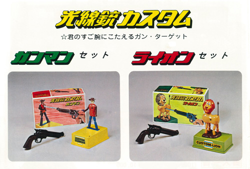 『光線銃カスタム』=当たる光の量によって抵抗値が変化するセンサーを使った電子玩具。1976年に『光線銃カスタム ガンマン』と『光線銃カスタム ライオン』の2種類が発売された。