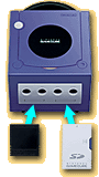 記念写真を撮るには、まずSDメモリーカードをセットしたSDカードアダプタを、ゲームキューブのスロットBに差し込みます。 |