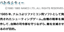 バトルシティー/(C)1980 1985 NAMCO LTD.,ALL RIGHTS RESERVED./1985年、ナムコよりファミコン用ソフトとして発売されたシューティングゲーム。自機の戦車を操作して、自陣の司令部を守りながら、敵を全滅させるのが目的。