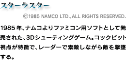 スターラスター/(C)1985 NAMCO LTD.,ALL RIGHTS RESERVED./1985年、ナムコよりファミコン用ソフトとして発売された、3Dシューティングゲーム。コックピット視点が特徴で、レーダーで索敵しながら敵を撃墜する。