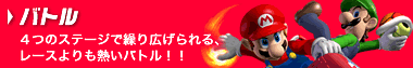 | マリオカートおなじみの“バトルモード”も、ダブルダッシュ!!でパワーアップ!今回は『ふうせんバトル』・『いただきシャイン』・『ドッカン!ボムへい』という3つのバトルを、奇想天外な4つのバトルステージで戦うぞ!さらに“あるレース”で優勝すると、幻の隠しステージもあらわれる…かも!? |