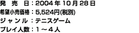発売日:2004年10月28日 希望小売価格:5,524円(税別) ジャンル:テニスプレイ人数:1〜4人 プレイ人数:1〜4人