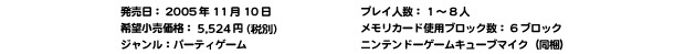 発売日/2005年11月10日・プレイ人数/1〜8人・希望小売価格/5,524円(税別)・メモリカード使用ブロック数/6ブロック・ジャンル/パーティゲーム・ニンテンドーゲームキューブマイク(同梱)