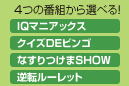 最大4人で対戦できるゲームモード。ボタンの早押しで解答権をうばい、マイクでクイズに答えていきます。遊べるクイズ番組は【クイズDEビンゴ】、【なすりつけまSHOW】、【逆転ルーレット】の3種類。出題のジャンルや難しさも自由に設定できるから、みんなで集まって気軽に楽しめます。家族や友だちのなかに、かくれたクイズ王がいるかも!?