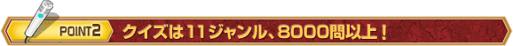 クイズは【食べ物】・【国語】・【スポーツ】・【歴史】・【乗り物】・【音楽】・【生き物】・【地理】・【雑学】・【マンガアニメ】・【ゲーム】の11ジャンルから出題。収録された問題の数は8000問以上です。 得意なジャンルはさらに知識を深めて、苦手ジャンルはあとでしっかり復習を。いろんなジャンルの問題を収録しているので、大人も子どももみんな一緒になって楽しめます。 |