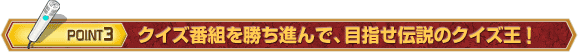 | 1人用モードでは、プレイヤーはいろんなルールで行われるクイズ番組に出場し、コンピュータを相手に優勝を目指して熱いクイズバトルを繰り広げます。強力なライバルたちを倒して、目指すは頂点である「伝説のクイズ王」! |