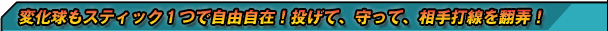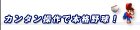 投球の基本もバッティングと同様、普通に投げる「ノーマルボール」と力のこもった「チャージボール」の2つのピッチングです。ボールを投げた後にコントローラスティックを左右に倒せば、誰でもカンタンに変化球が投げられます。上級者になればチェンジアップなどもおりまぜて投球を組み立てることも 。 |