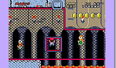 | 『スーパーマリオサンシャイン』でも楽しめるマリオの金網アクションは、このゲームで初めて登場しました。回転扉を使えば裏側へまわることができます。 |