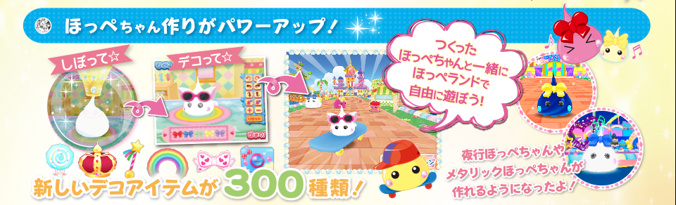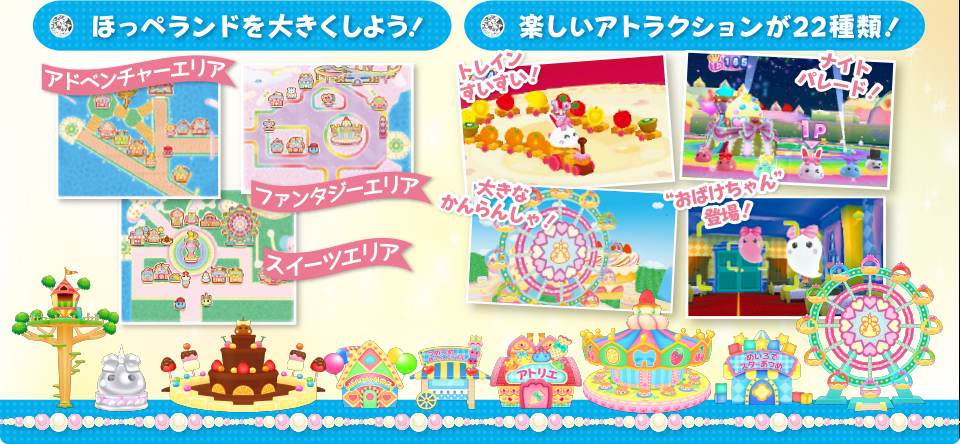 • 夢とキラキラでいっぱいのほっぺランドでたくさんあそんじゃお!大人気「ほっぺちゃん」のゲーム第2弾が登場! ほっぺちゃんのテーマパーク「ほっぺランド」を舞台に、あなただけのほっぺちゃんを作って遊びましょう。ランドの中には楽しいアトラクションが22種類!すべてのアトラクションがお友達との通信プレイに対応していて、最大4人まで遊べます。