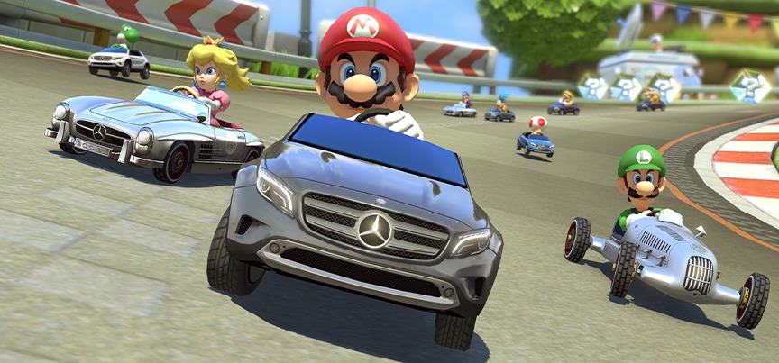 3台のマシンをダウンロード 「メルセデス・ベンツ」のホンモノの車が「マリオカート8」の世界に登場!3台のマシンが、インターネットから無料でダウンロードすることができるよ。