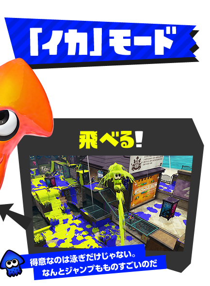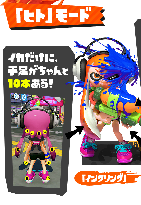 • 「ヒト」モード イカだけに、手足がちゃんと10本ある!名前は「インクリング」インクを塗り合う「ナワバリバトル」が好き