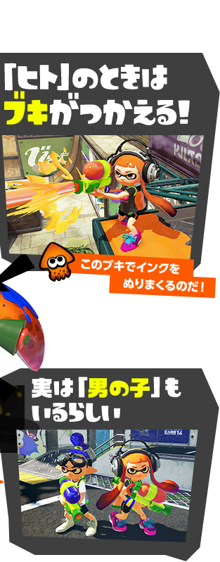 • 「ヒト」のときはブキがつかえる!このブキでインクをぬりまくるのだ!実は「男の子」もいるらしい