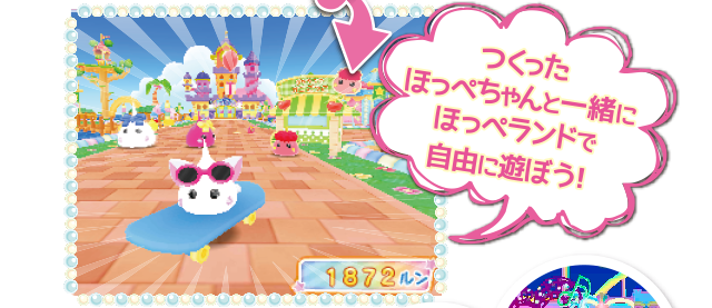 大人気「ほっぺちゃん」のゲーム第2弾が登場! ほっぺちゃんのテーマパーク「ほっぺランド」を舞台に、あなただけのほっぺちゃんを作って遊びましょう。ランドの中には楽しいアトラクションが22種類!すべてのアトラクションがお友達との通信プレイに対応していて、最大4人まで遊べます。