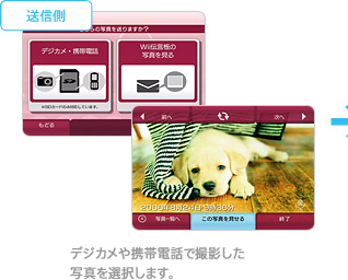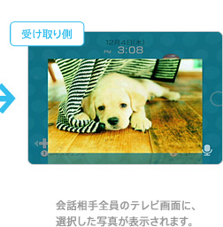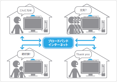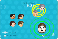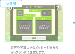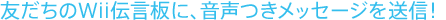 Wiiフレンドになった友だち同士、Wii本体に「Wiiスピーク」をつなげて『Wiiスピークチャンネル』を使うと、お互いのリビングとリビングがつながり、その場にいるような感覚で会話が楽しめます。最大4台のWiiの間で一度に会話ができ、受話器などは使わず室内にいる全員が会話に参加できます。また、通話料金は無料です(※)。 画面には、お互いのMiiを表示させることもできます。 ※ブロードバンド・インターネット環境が必要になりますので、別途プロバイダ費用等の通信料がかかります。 ![]() SDメモリーカードやWii本体に保存されている写真をみんなに送って、一緒に見ながら会話することもできます。 ![]() ![]() Wiiフレンドになった友だちのWii伝言板に、音声つきのメッセージを送ることができます。音声つきのメッセージは、友だちのWiiに「Wiiスピーク」や『Wiiスピークチャンネル』がなくても再生することができます。 ※一度に送信できる音声は10秒までです。 ![]() ![]() Wii本体のUSB端子に接続する、マイク機能を持った周辺機器です。テレビの上に設置して、インターネットを通じて遠く離れた人と会話することができます。