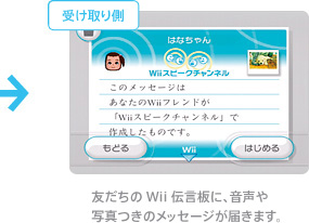 『Wiiスピークチャンネル』は、「Wiiスピーク」を使って遠く離れた友だちと会話を楽しんだり、友だちのWiiに音声つきメッセージを送ったりすることができるチャンネルです。