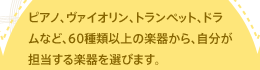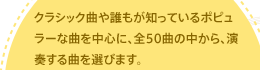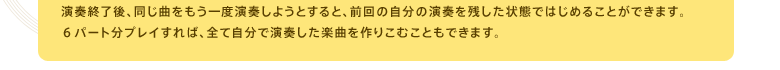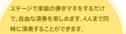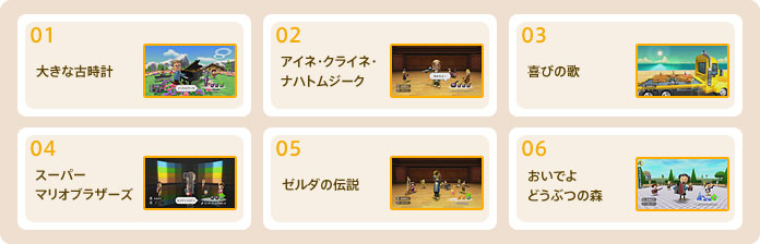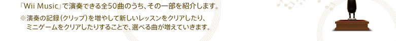 誰もが知っているおなじみの曲をそれらしく演奏したり、自由に変えて演奏したり。『Wii Music』では、楽譜にとらわれない自由な「アドリブ演奏」を楽しむことができます。また、演奏できる楽器は60種類以上用意されているので、その組み合わせ次第で、同じ曲でも無限のアレンジを楽しむことができます。
