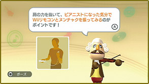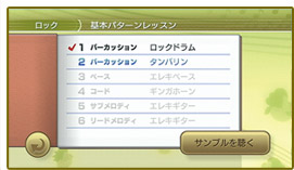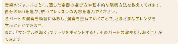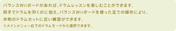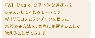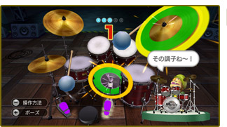 『Wii Music』には、遊び方や演奏におけるアレンジ方法を簡単に理解することができるレッスンモードが 用意されているほか、実際のドラムを叩くようにドラムの練習ができるドラムレッスンも収録されています。