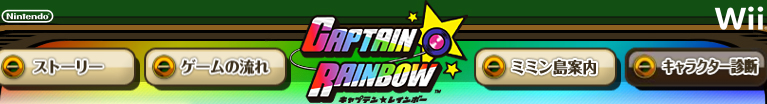 Wiiトップページ 任天堂ホームページ ストーリー ゲームの流れ ミミン島案内 キャラクター診断 キャプテン★レインボー スタート トップページへ戻る