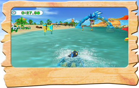 水上のコースを泳いで進み、ゴールまでのタイムを競います。旗の間を通るとスピードが一気にアップ。キバニア、サメハダーに当たらないように気をつけながらゴールを目指します。