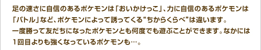 ポケパークで出会ったポケモン同士で遊ぶ“ちからくらべ”。「おいかけっこ」や「バトル」などで勝負して、勝てばそのポケモンと友だちになることができます。