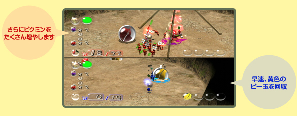 さらにピクミンをたくさん増やします さらにピクミンをたくさん増やしますさらにピクミンをたくさん増やします 早速、黄色のビー玉を回収 早速、黄色のビー玉を回収 早速、黄色のビー玉を回収