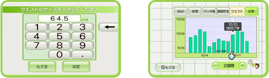 『Wii Fit Plus』以外で行った運動の時間のほか、自分のウエストサイズや歩数などのデータを毎日のグラフに記録することができます。
